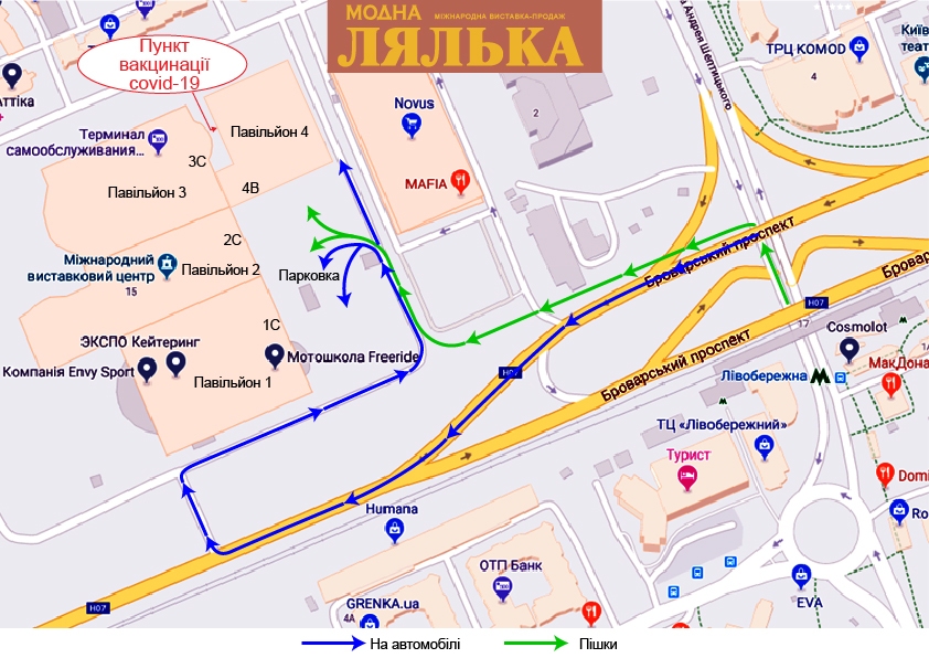 ► Автомобілем до МВЦ можна проїхати з Броварського проспекту або з вулиці Микільсько-Слобідської